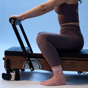 Earn your stripes with our game-changing non-slip soft cotton Reformer Pilates socks in rose pink, with extra grippy soles to help you get the most out of your moves.